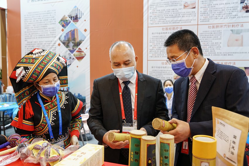 大會現(xiàn)場,廣西國際壯醫(yī)醫(yī)院展廳前人頭攢動,壯醫(yī)藥物竹罐療法、壯醫(yī)經(jīng)筋療法、壯醫(yī)水蛭療法、壯醫(yī)臍灸療法等多個自治區(qū)級、市級非物質(zhì)文化遺產(chǎn)項目,引得不少人駐足體驗。